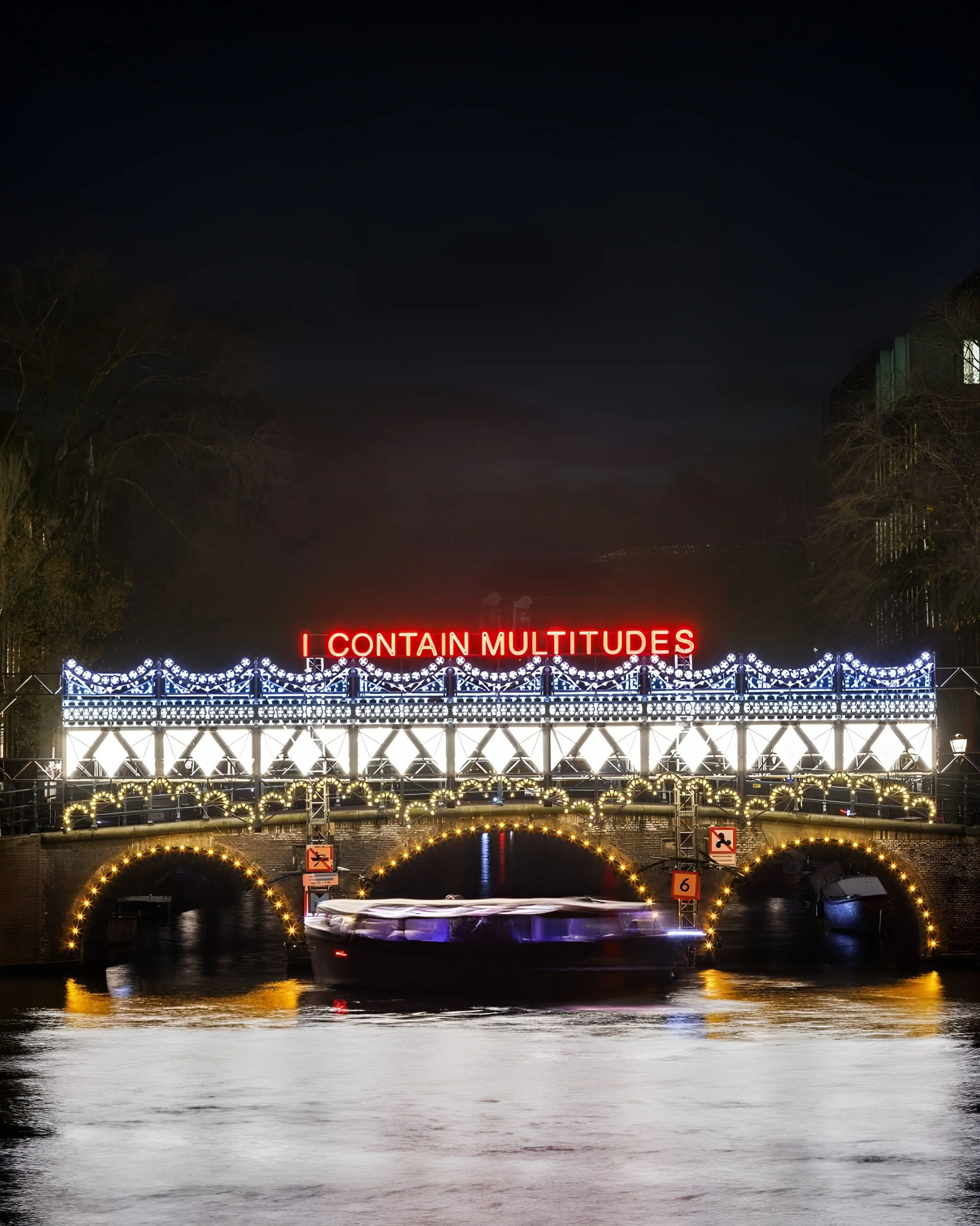 “I Contain Multitudes” è un’installazione luminosa firmata da Marinella Senatore e realizzata da Studio Light Mariano ad Amsterdam nel 2025, nell’ambito dell’Amsterdam Light Festival.