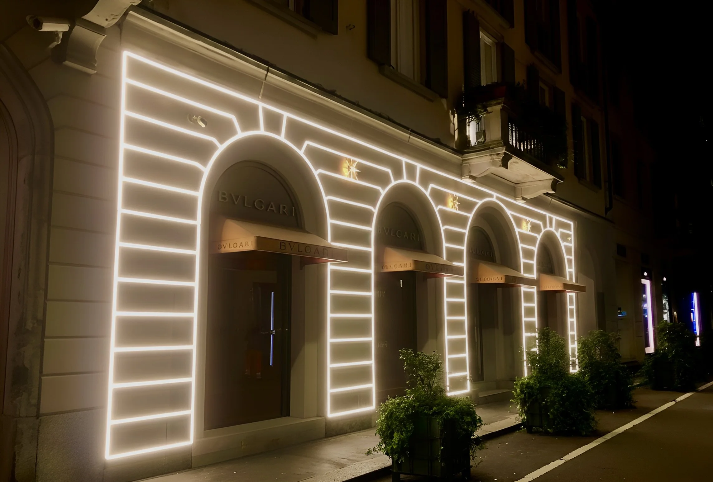 Nel 2024, a via del Gesù di Milano ha accolto un’ illuminazione architetturale con profili Neonflex LED monofacciale integrati alla pelle della facciata, reinterpretando il linguaggio visivo del brand con linee luminose continue e uniformi, capaci di valorizzare la morfologia delle aperture e dei volumi.